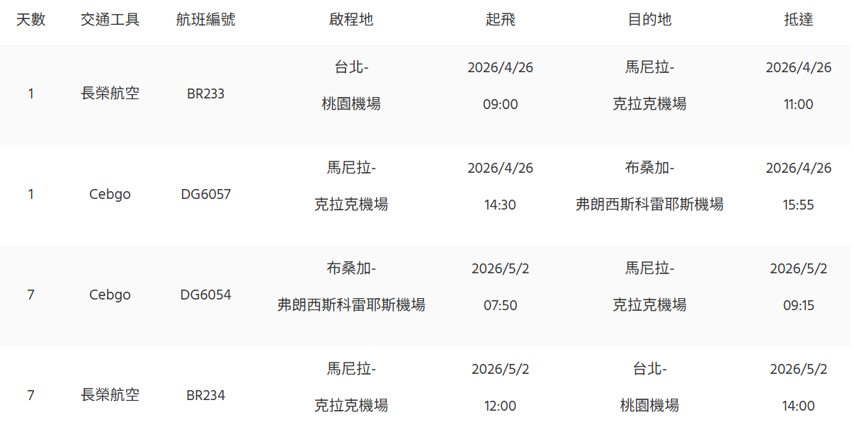 航班資訊:台北 - 馬尼拉 - 布桑加